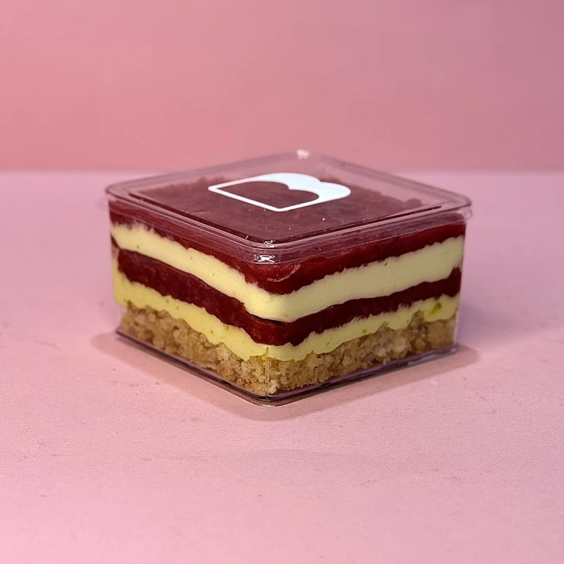 Многослойный десерт из натурального фисташкового крема в сочетании с сочной малиной и ванильным бисквитом